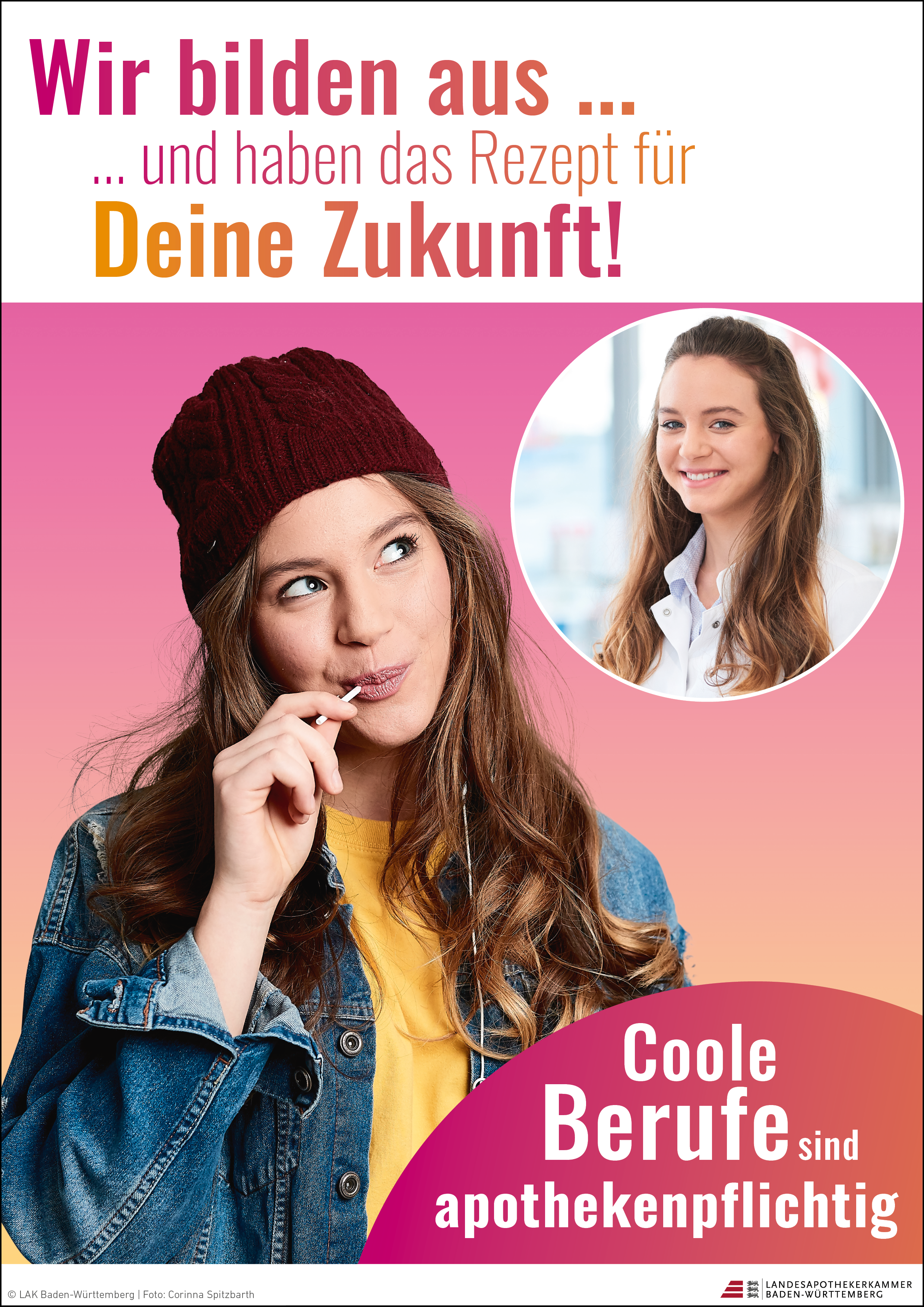Im Rahmen der Nachwuchsoffensive hat die Landesapothekerkammer Baden-Württemberg Plakate entworfen, mit denen Sie Ihre Ausbildungsbereitschaft unter dem Motto „Wir bilden aus…und haben das Rezept für Deine Zukunft“ signalisieren können.
